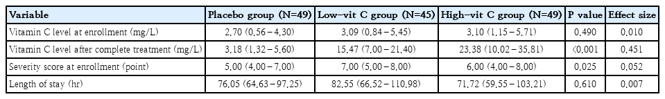 At enrollment, the clinical severity score of the low-vit C group was higher than that of the other 2 groups. The difference was statistically significant (P=0.025). The clinical score values of each group were recorded every 12 hours. Therefore, we use a comparison between the mean clinical score at the time of evaluation and the score at the time of enrollment (mean difference score). The mean difference changes of clinical score from the enrollment are shown in Fig. 2. Both the low-vit C and high-vit C groups showed improvement in their clinical scores more rapidly than seen in the placebo group over the 48 hours to 72 hours of the treatment period. The greatest change in clinical score occurred at 48 hours of treatment, in the low-vit C group (P=0.039). That change was greater than the change recorded for the high-vit C group, and both of these groups showed a greater improvement in clinical score than was recorded in the placebo group. LOS was lowest in the high-vit C group (71.72 hours), the placebo group (76.05 hours) and the low-vit C group (82.55 hours). None of these values showed a statistically significant difference. (Table 2).
