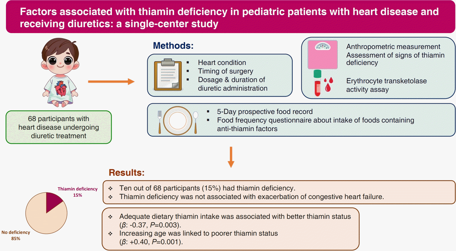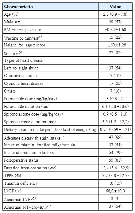 The primary objective of this study was to determine the proportion of TD in pediatric patients with heart disease undergoing diuretic treatment. The secondary objective was to evaluate the factors associated with thiamin status in this group of patients.