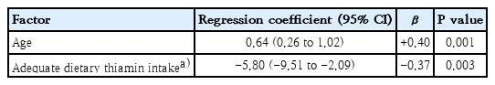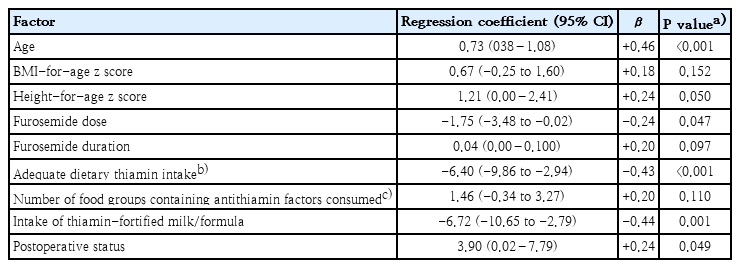 The simple linear regression analysis of the association between TPPE and various factors is presented in Table 2. Factors with a P value <0.2 in simple linear regression, which included age, BMI-for-age z score, height-for-age z score, dosage and duration of furosemide, adequate dietary thiamin intake, intake of thiamin-fortified milk/formula, number of food groups containing antithiamin factors consumed, and postoperative status, were considered potential factors and were selected for inclusion in the multiple linear regression analysis. Ultimately, age (β=+0.40, P=0.001) and adequate dietary thiamin intake (β=-0.37, P=0.003) were found to have significant independent associations with TPPE values, as presented in Table 3.