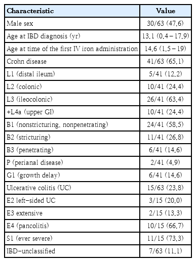 Demographic and clinical data recorded for each participant included: IBD type (Crohn disease, Ulcerative Colitis or IBD-unclassified), IBD phenotype (Paris classification), sex, age at the time of IBD diagnosis and at the time of IV iron treatment, disease activity assessed with the Pediatric Crohn’s Disease Activity Index (PCDAI) or the Pediatric Ulcerative Colitis Activity Index (PUCAI) at the time of treatment and posttreatment evaluations, IBD treatment at the time of treatment and posttreatment evaluations.