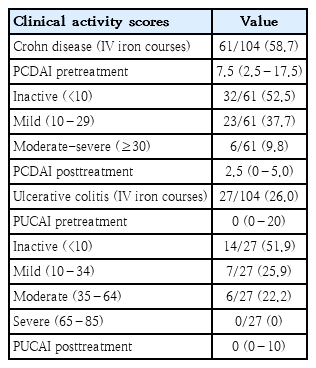 At the time of IV iron treatment, most patients in our cohort had mild or inactive disease according to clinical activity scores. However, calprotectin levels, when available, suggested active inflammation. There was a global reduction of the activity scores and inflammatory markers (ESR, CRP) from pre- to posttreatment evaluations, even in the group of patients who initially showed moderatesevere activity. This reduction may indicate that disease activity was successfully controlled in most patients between the 2 evaluations. Unfortunately, calprotectin levels from both pre- and posttreatment evaluations were only available in 39 treatment courses (in which a reduction from pre- to posttreatment evaluations was also noted). Therefore, we must consider that, despite low clinical activity scores and low serum inflammatory markers at the time of treatment, iron deficiency may be an early sign of disease activity, which was corroborated by calprotectin levels, when available.