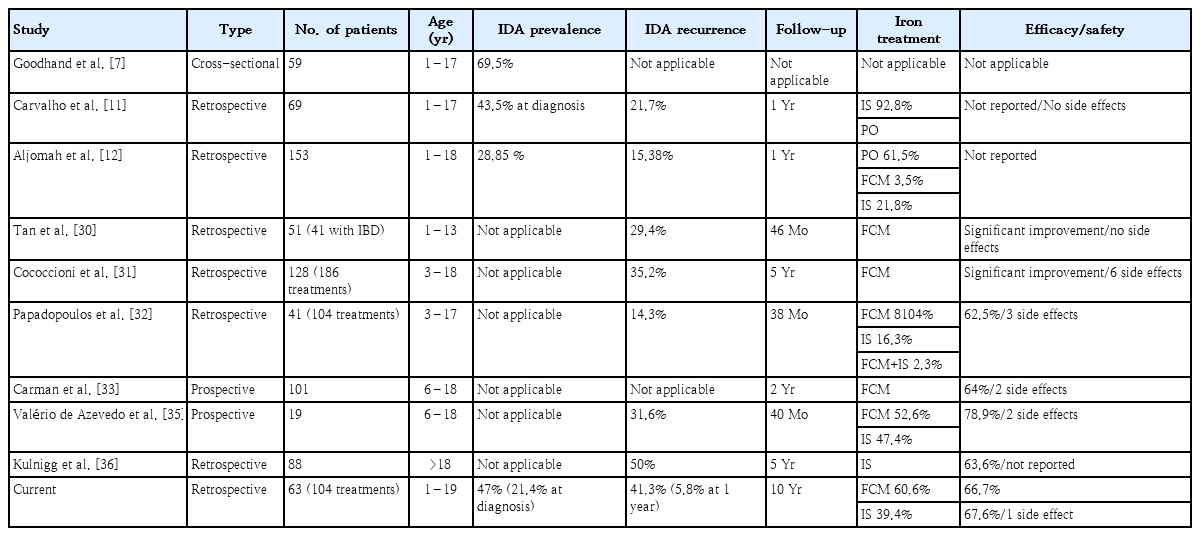 During the 10 years of study, recurrent ID with or without anemia, affected 26 patients (41.3%), with median interval of 1.4 years between IV iron administration courses. This is higher than the recurrence rate reported in other pediatric studies which had, however, a shorter follow-up: Papadopoulos et al. [32] reported a 14.6% recurrence of IDA over 38 months, Tan et al. [30] reported a 29.4% recurrence over 46 months, with a median interval of 12 months between IV iron treatment courses, Cococcioni et al. [31] reported a 35.2% recurrence during 5 years of follow-up with a median interval of 37.9 weeks (approximately 8.5 months) between IV iron courses, and in a previous prospective 40 months study in our Unit a 31.6% recurrence of IDA was identified, with a median 15.5 month period between treatments [35]. Kulnigg et al. [36], in a 5-year study in the adult population, identified anemia recurrence in 50% of patients after 10 months of treatment. Table 3 contains key findings from relevant studies on Pediatric Inflammatory Bowel Disease associated IDA and the study of Kulnigg et al. [36] in the adult population.
