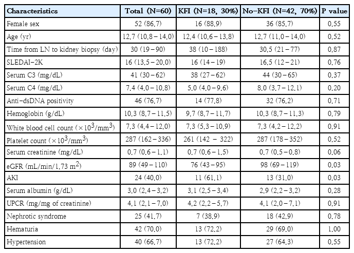 The median age at kidney biopsy was 12.7 years (10.8–14.0). The median interval from the diagnosis of LN to kidney biopsy was 30 (19–90) days, and the SLEDAI-2K score was 16 (13.5–20). The median levels of serum C3 and C4 were 41 (30–62) and 7.4 (4.0–10.8) mg/dL, respectively.