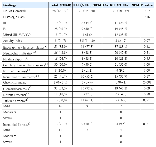Histological findings of kidney biopsy are presented in Table 2. The median number of glomeruli per biopsy was 28 (18–36). Pure proliferative LN (class III or IV) was identified in 47 patients (78.3%). The median AI was 3 (2–7). The most frequent AI component was endocapillary hypercellularity (51 patients, 85.0%), followed by cellular/fibrocellular crescents (30 patients, 50.0%). Interstitial inflammation was observed in 25 patients (41.7%).