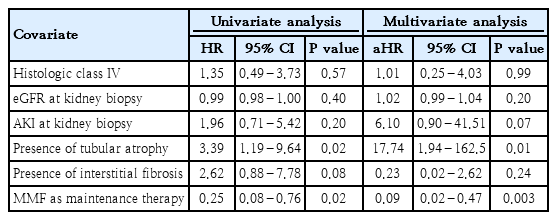 Six variables were included in Cox regression analysis: histologic class IV, eGFR at biopsy, AKI at biopsy, presence of TA, presence of interstitial fibrosis, and MMF use for maintenance therapy (Table 4). In univariate analysis, the presence of TA was associated with more than a threefold increased hazard of developing kidney function impairment (HR, 3.39, 95% CI, 1.19–9.64; P=0.02), while MMF use was associated with a 75% reduction in risk (HR, 0.25; 95% CI, 0.08–0.76; P=0.02).